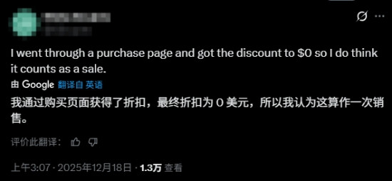 虽然官方并没有明确提到这次突破销量里程碑与“Epic喜加一”活动有关,但评论区中有玩家表示,在Epic平台领取游戏时会进行一次折扣为100%的购买,所以在Epic上免费领取的游戏同样被算在了总销量当中。
